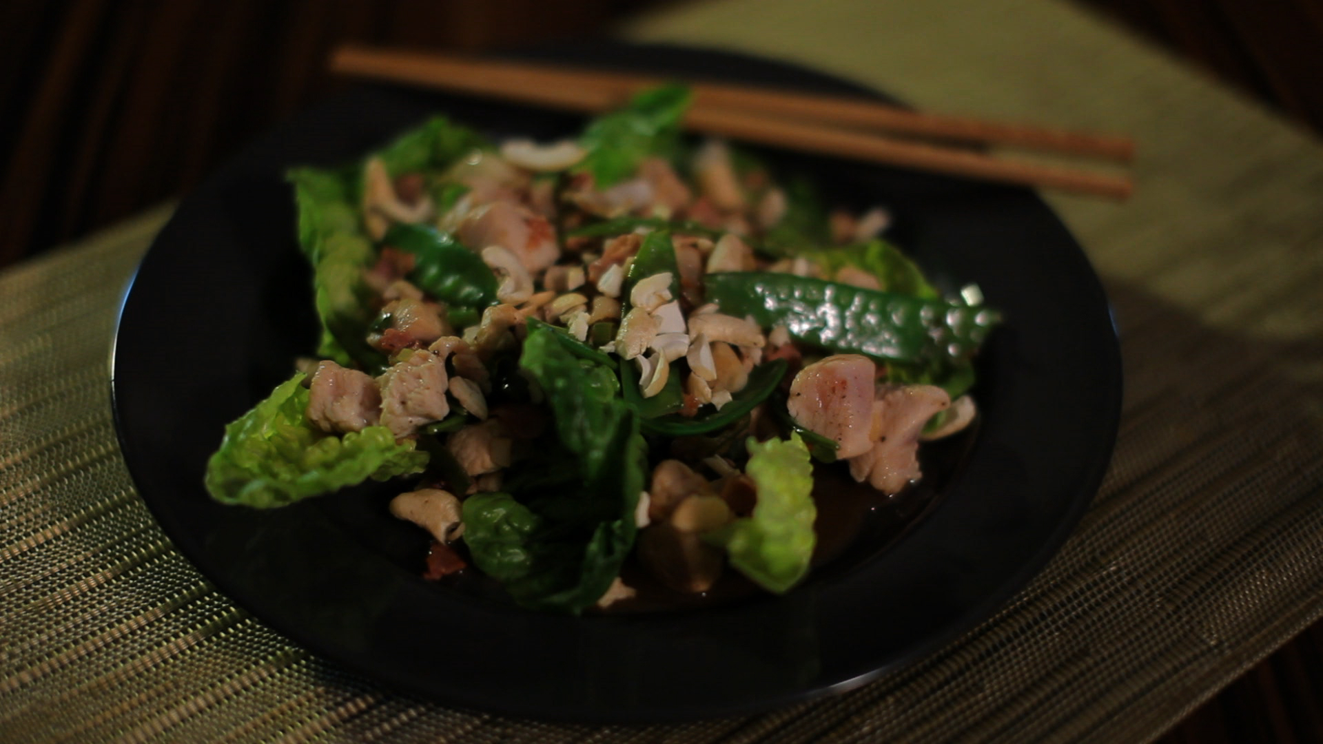 Kevés olajon megpirítjuk a bacont a fokhagymával és a gyömbérrel. Hozzáadjuk a csirkemell kockákat, sózzuk, borsozzuk. Ekkor kerül bele az újhagyma és a cukorborsó, majd jöhetnek az ízesítő olajok és szószok, ízlés szerint. Szívsaláta levélre tálaljuk, és a végén megszórjuk kesudióval.