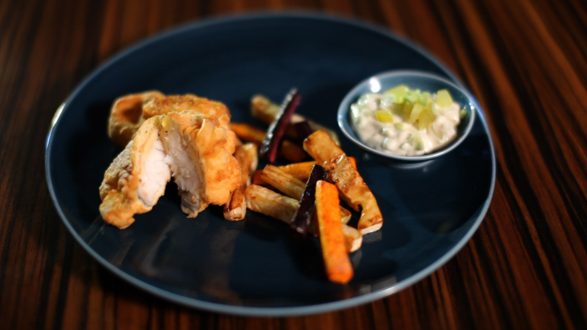 Egy klasszikus egészséges körettel! Tálaljuk a sörtésztában sütött halszeleteket ezúttal zöldséghasábokkal! Meglepődsz majd, milyen népszerű lesz a sárgarépa, a zeller vagy a cékla a majonézes mártásba mártogatva!