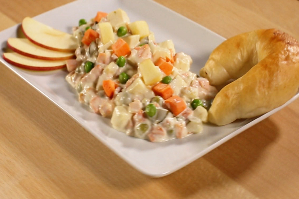 Ennek a jóízű majonézes salátának semmi köze a francia konyhához. Hidegtálak elmaradhatatlan része. Mutatós a szemnek a színes zöldségek miatt, és pikánsan ízletes a benne lévő nyers almának és ropogós csemegeuborkának köszönhetően.