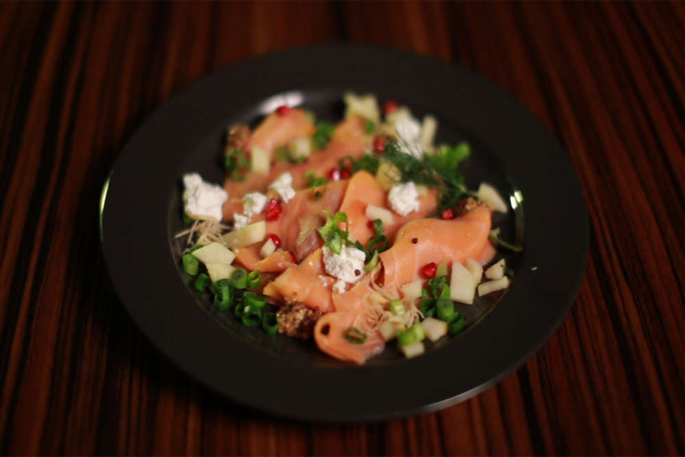 Az almát meghámozzuk és apró kockákra vágjuk. Az újhagymát vékonyra felkarikázzuk zöldjével együtt, és már tálalhatunk is. Alulra kerül a tányérra a lazacszelet, amit megszórunk az almával, a hagymával, a tormával és a krémsajttal. Mustár halmokat teszünk a tányér szélére, megszórjuk rózsaborssal és hintünk rá gránátalma magokat.