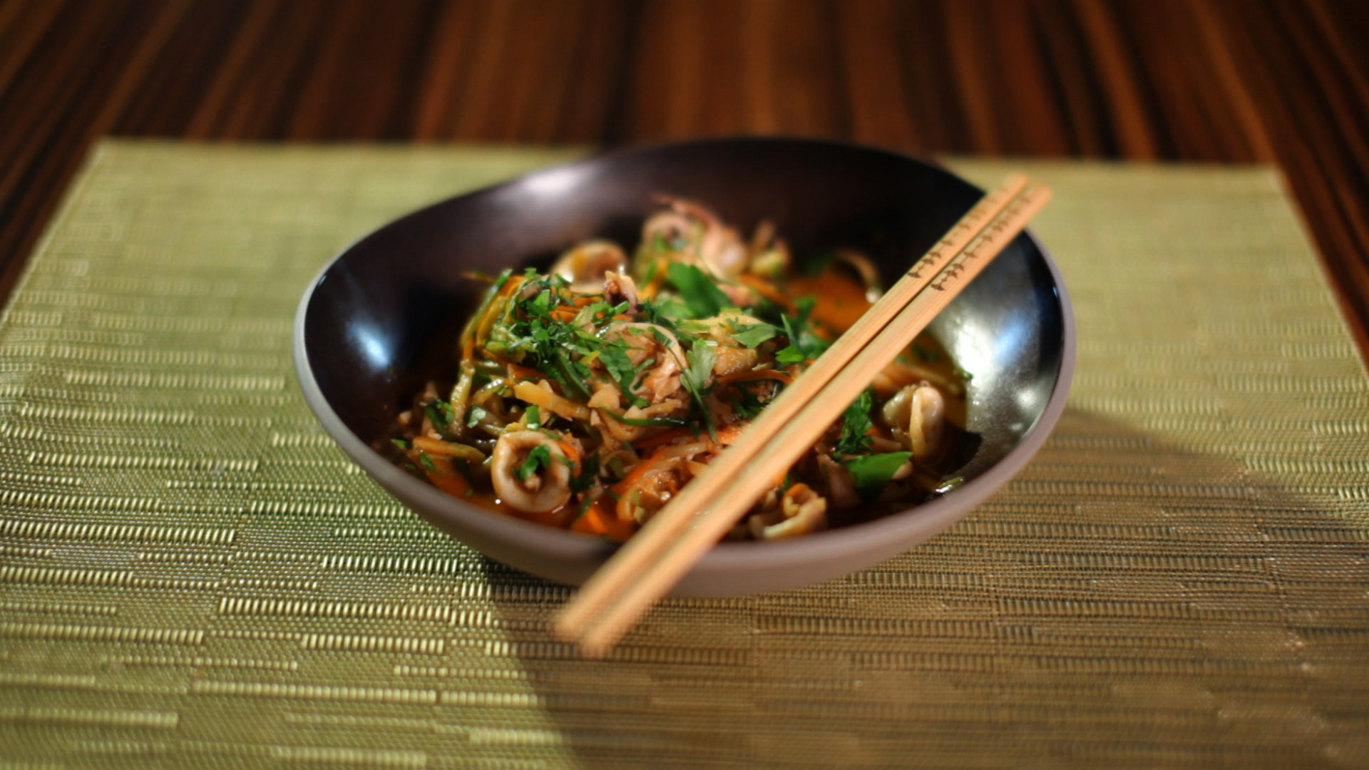 A zöldségeket nagyon vékony csíkokra vágjuk, a tintahalat feldaraboljuk. Wokban kevés olajon megpirítjuk a tintahal darabokat, sózzuk, borsozzuk, halszósszal ízesítjük, majd kiszedjük és félretesszük. A wokban elkezdjük pirítani a zöldségeket. Először jöhet a gyömbér, rá a fokhagyma, majd egy kis garnéla paszta és kevés víz. Ezután jöhet vissza a tintahal, rá a szójaszósz, a spagetti tészta, a zöldség csíkok, és végül a friss petrezselyem.