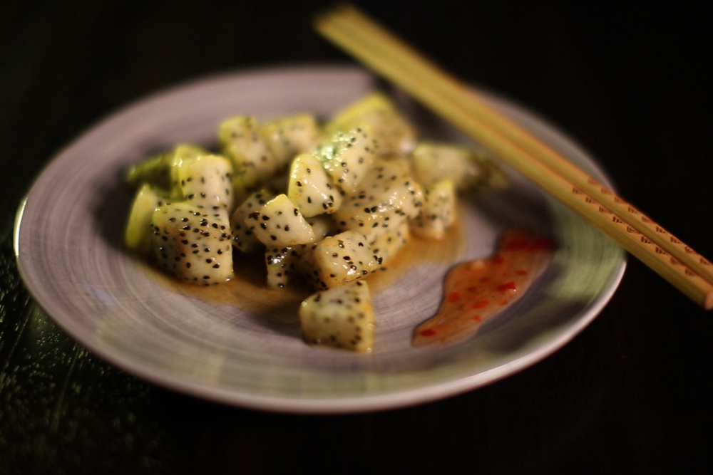 A sárkánygyümölcsöt kiszedjük a héjából, és felkockázzuk. A vizet összeforraljuk a lime lével, hozzáadjuk a cukrot, és megpirítjuk. Fűszerekkel ízesítjük, majd jól beleforgatjuk a sárkánygyümölcs kockákat. Édes chiliszósszal tálaljuk.