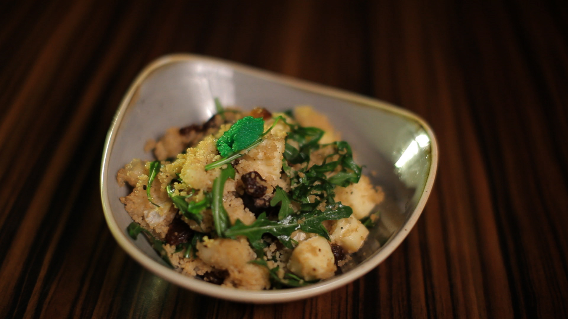 A körtét és a brie sajtot felkockázzuk. Apróra vágjuk az olívabogyót. Egy tálban összekeverjük a kész kuszkuszt a mazsolával és a körtével. Olívaolajat öntünk rá, megkeverjük és hozzáadjuk a rukkolát, olívabogyót és a brie sajtot. Sózzuk, borsozzuk, a végén wasabi kaviárral díszítjük.
