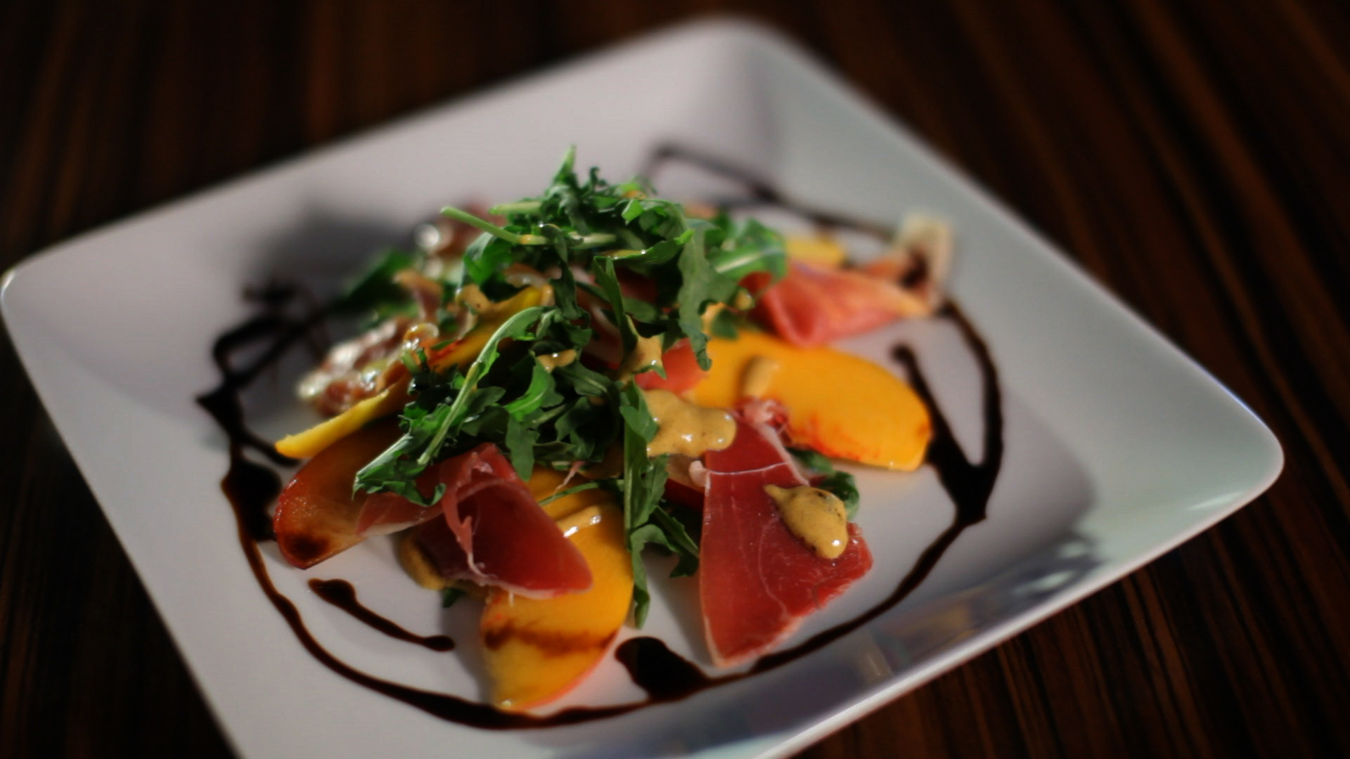 A balzsamecetet sziruppá forraljuk. Összekeverjük a hozzávalókat a mustáros vinaigrette mártáshoz, hagyjuk összeérni az ízeket, majd tálaljuk a salátát. Alulra kerül a rukkola, rá a felszeletelt gyümölcs, egy kis mustáros mártás, majd a sonka szeletek, a sajt forgácsok és végül a balzsamecet cseppek.