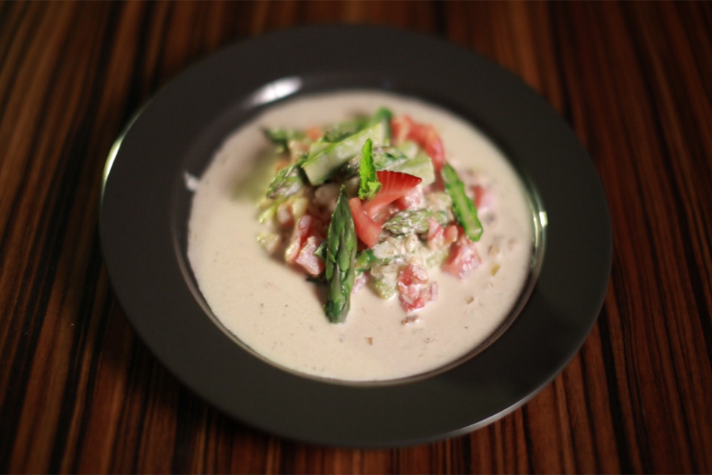 A paradicsomot forró vízbe mártva ügyesen lehámozzuk, kimagozzuk és apróra vágjuk. A spárgát megtisztítjuk, kettéhasítjuk, forró vízben megfőzzük. Jeges vízbe kiszedjük, hogy megtartsa színét, és kisebb darabokra vágjuk. A mogyorót összenyomjuk, aprítjuk. Kevés vajat olvasztunk, karamellizáljuk rajta a barna cukrot, hozzáadjuk az apróra vágott hagymát, majd felöntjük a fehér borral. Jöhet hozzá a zöldség alaplé is. Ha összeforrt, mehet bele a mogyoró, egy lime leve, só és bors. A tejszín, a tej és a mascarpone hozzáadásával krémes alappá főzzük az egészet, majd beletesszük a paradicsom és spárga darabokat. Jól összefőzzük, és tálaljuk.