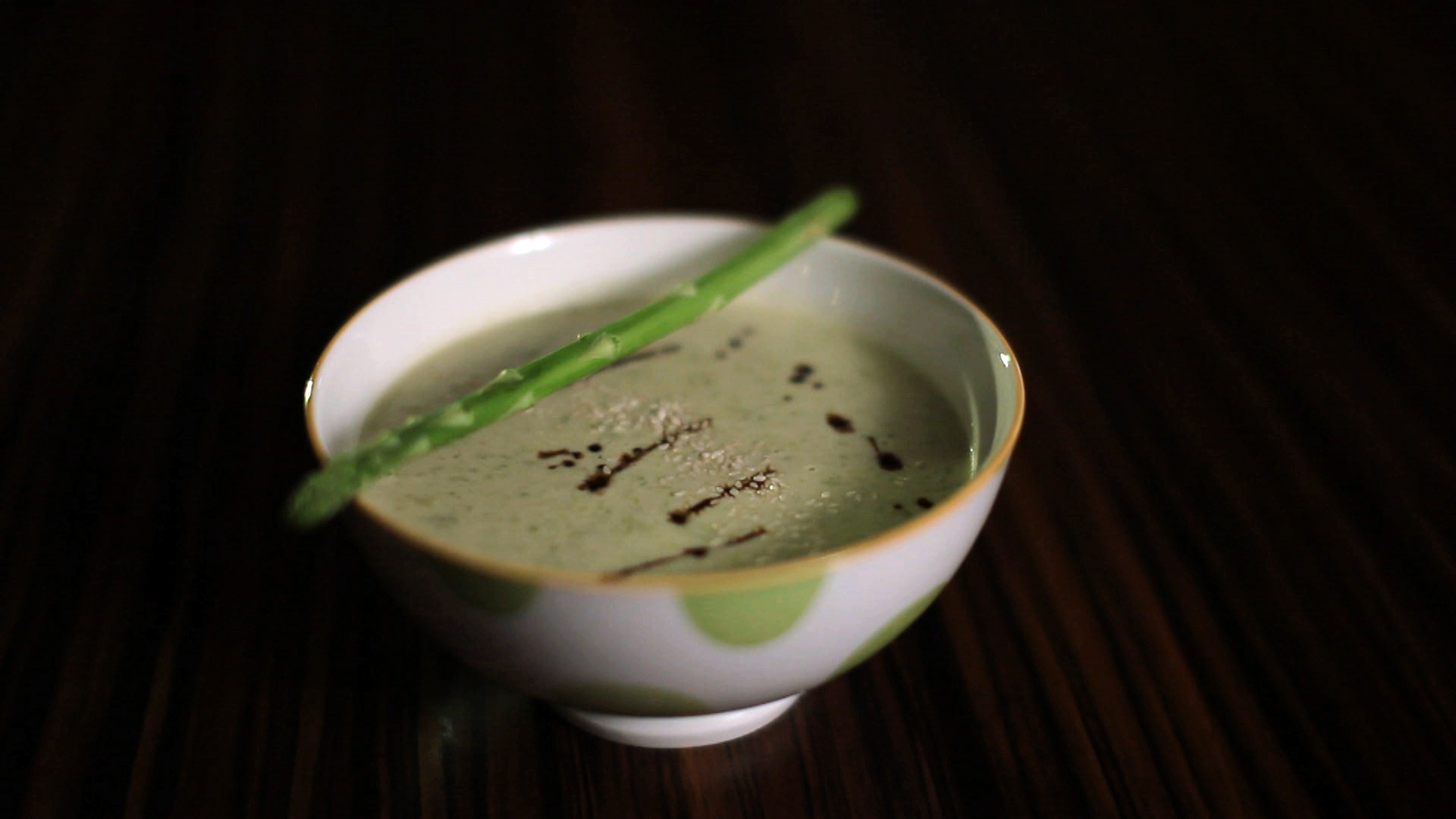 A zöldspárga sípokat apróra vágjuk. Kevés olívaolajon átfogatjuk, sózzuk. Felöntjük a vízzel és a tejszínnel, alaposan összeforraljuk, kb 15 perc alatt megpuhul. Kevés balzsamecettel, őrölt szerecsendióval ízesítjük, majd rizsliszttel besűrítjük. Végül botmixerrel simára turmixoljuk. Balzsamecet cseppekkel és szezámmaggal diszítjük.
