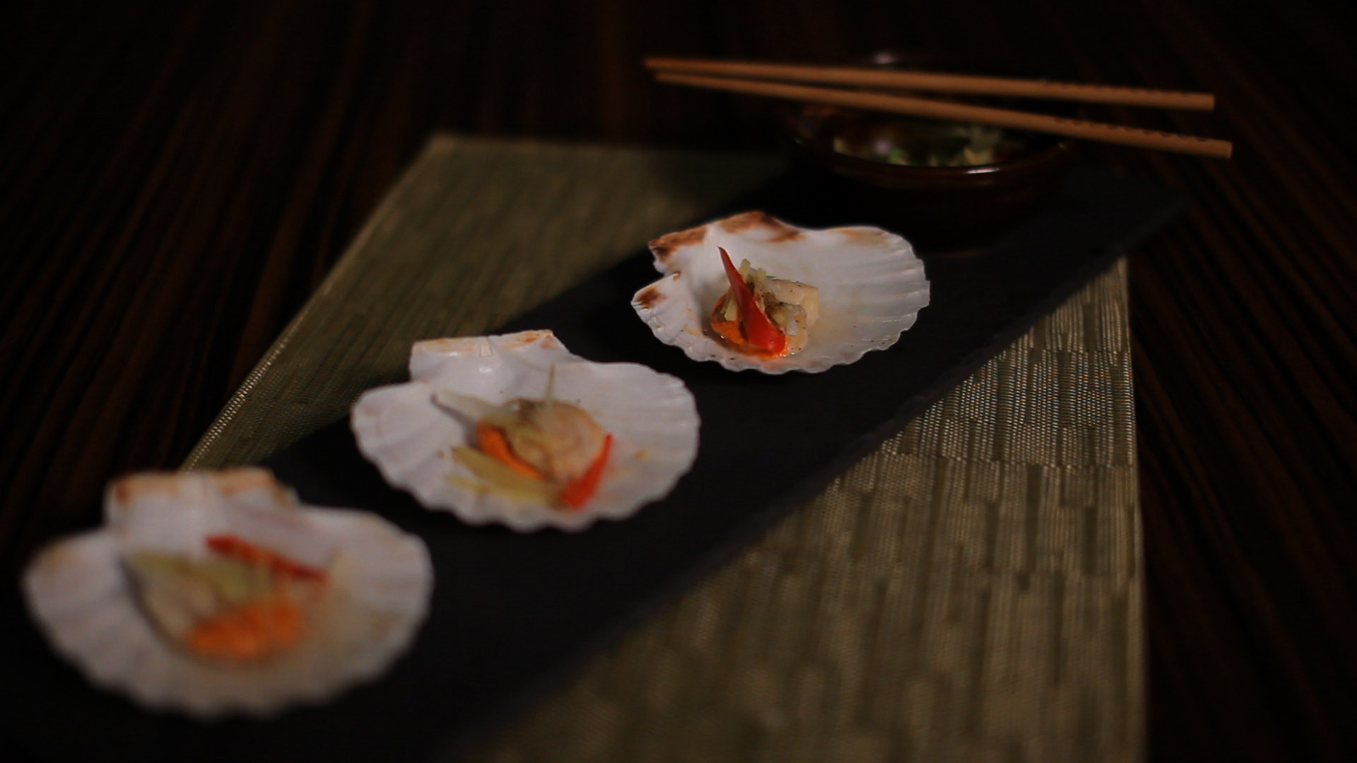 Megtisztítjuk és apróra vágjuk az újhagymát, a chilipaprikát és a gyömbért. Vízfürdőben, lefedve, 20 perc alatt puhára pároljuk a sóval, borssal fűszerezett kagylókat, amelyek húsára és ikrájára gyömbér és chili csíkokat szórtunk. Mogyoróolajat forrósítunk, és a kis tálba szórt újhagyma, gyömbér, chili salátát nyakon öntjük a sistergő mogyoróolajjal. A gőzölt kagyló mellé kínáljuk a forró olajos salátát.