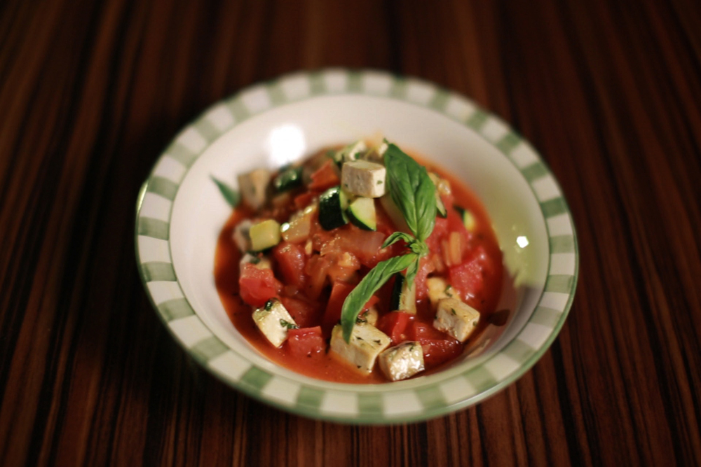 A cukkinit kockákra vágjuk, a paradicsomot felaprítjuk. A vöröshagymát és a fokhagymát finomra vágjuk. A tofut is felkockázzuk, majd olívaolajban a fokhagyma felével és friss zöldfűszerek hozzáadásával marináljuk. Olívaolajon megpirítjuk a vöröshagymát, hozzáadjuk a fokhagyma maradékát, sóval és borssal ízesítjük, majd jöhet bele a paradicsom. Kicsit hagyjuk összefőni, majd paradicsompürével, fehérborral és zöldség alaplével készre főzzük. Ha kell, kevés barnacukorral, sóval és borssal fűszerezzük. A cukkini kockákat kevés olívaolajon átpirítjuk. A marinált tofuval ugyanezt tesszük, majd tálalhatjuk is az ételt: alulra a cukkini és a tofu, majd jöhet rá a paradicsomos ragu.