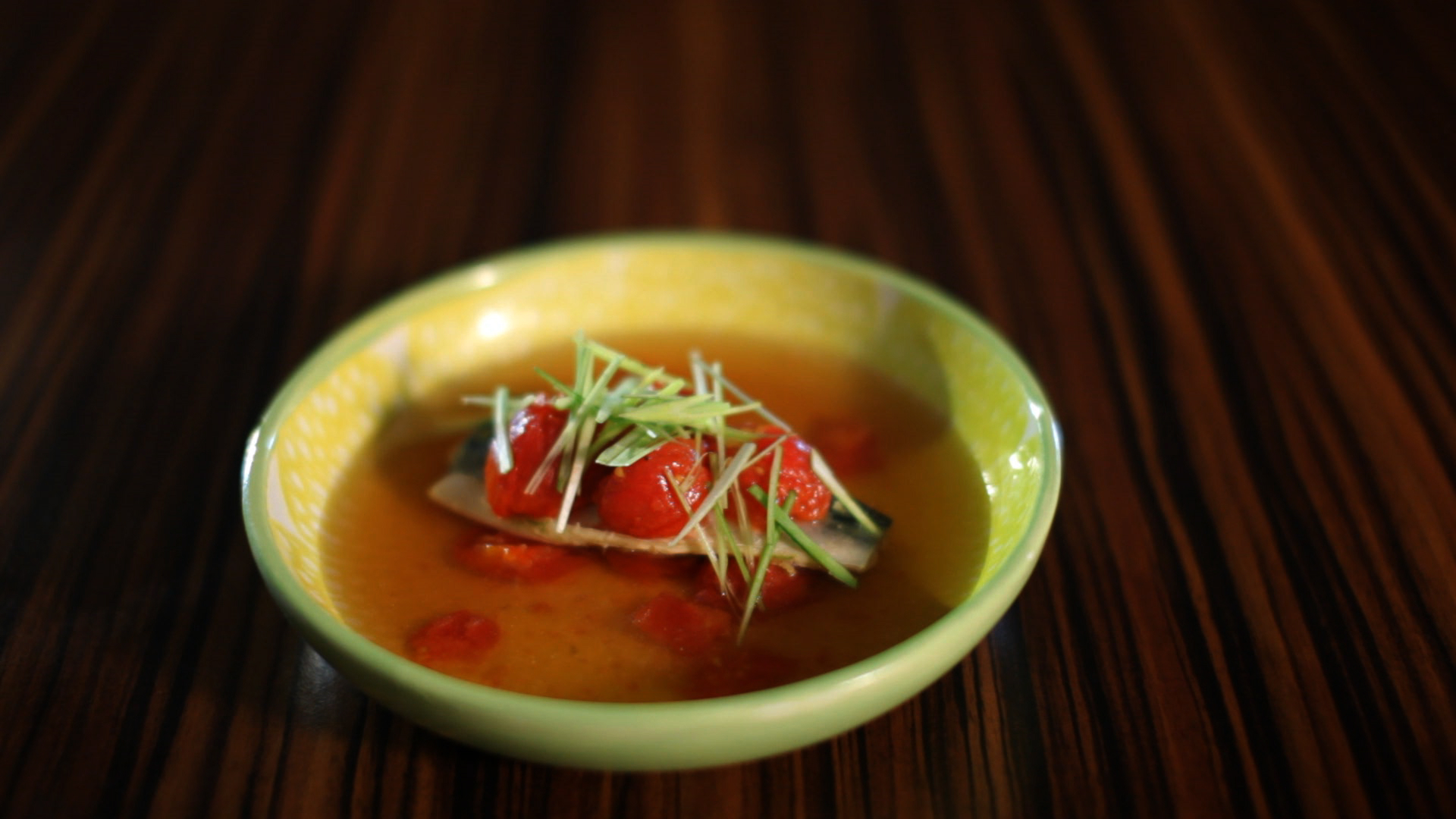 A makréla filéket fűszerezzük koriander maggal, sóval, cukorral, citrom és lime héjjal. lefóliázzuk, kicsit állni hagyjuk, majd az umami leves alaplében mindkét oldalukon posírozzuk.