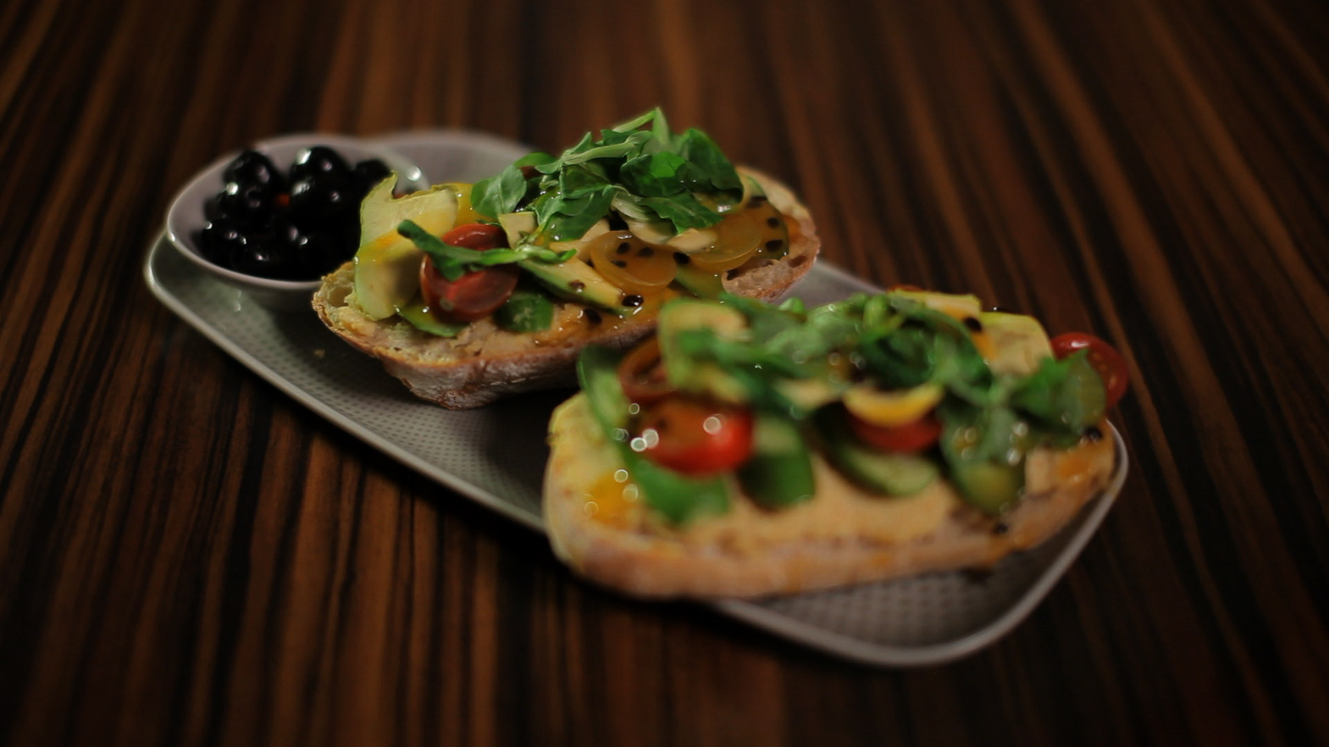Ügyesen kiemeljük az érett avokádó belsejét, majd kis szeletkéket vágunk belőle. Feldaraboljuk a paradicsomot és az uborkákat is. A kenyérszeleteket megkenjük hummusszal, és szépen sorban rápakoljuk a zöldségeket, a salátát, végül leöntjük maracuja szósszal.