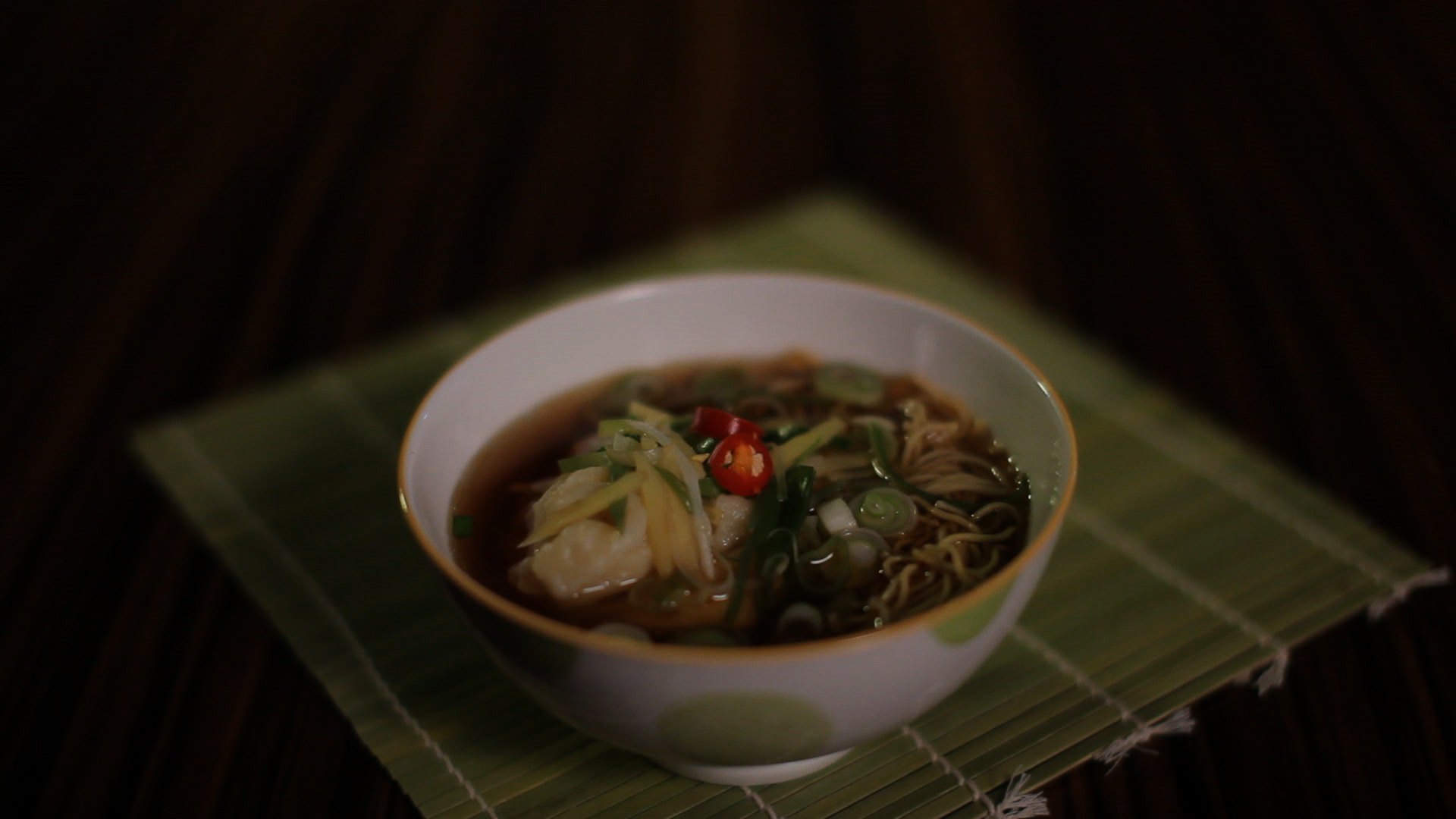 A kész, leszűrt marhahúslevesbe beletesszük az újhagymát és a gyömbért, ízesítjük a szószokkal, és jól összeforraljuk. Tálaláskor a leves csészék aljára tesszük a tésztát, szezámolajat csepegtetünk rá, megszórjuk újhagyma karikákkal, hozzáadunk 1-1 gombócot, majd rámerjük a forró levest. Ha szeretjük a csípős ízt, néhány karika chili paprika is jöhet a tetejére.