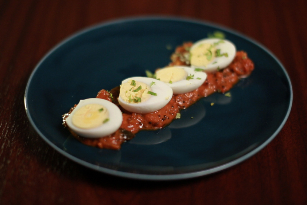 Egy különleges mártás, amivel élmény lesz a főtt tojásból! Fűszeres, pikáns és erős, de ugyanannyira krémes és ropogós is. Ugye, hogy kíváncsivá tettünk? Hozzávalók: 4 db főtt tojás maroknyi földimogyoró 1 salotta hagyma 3 gerezd fokhagyma 2 cm gyömbér kevés olívaolaj fűszerek: curry levél, őrölt római kömény, mustármag, turmerik, zöld chili, őrölt koriandermag 1 evőkanál paradicsompüré 1 evőkanál tamarind püré 0,5 dl zöldség alaplé 1 evőkanál barnacukor 1 citrom leve 2-3 evőkanál kókusztej 2-3 koktélparadicsom A főtt tojásokat félbevágjuk, a mogyorót aprítjuk, a salotta hagymát és a gyömbért finomra, a fokhagymát szeletkékre vágjuk. Kevés olívaolajon megpirítjuk a fűszereket (curry levél, őrölt római kömény, mustármag), majd jöhet bele a paradicsompüré és a salotta hagyma is. Tamarind pürével és turmerikkel ízesítjük, néhány zöld chili darabkával és a gyömbérrel tesszük csípőssé. Felöntjük zöldséglével, és forrás közben hozzáadjuk a fokhagymát, az őrölt koriandermagot, a barna cukrot és a citromlét. Kókusztejjel összeforraljuk, és most adjuk hozzá a darabolt koktélparadicsomot és legvégül az aprított földimogyorót. Tálaláskor a currys alapra kerülnek a főtt tojások. Tipp: Ügyesen variálhatsz az ízekkel: ha nem szereted nagyon csípősen, hagyd ki a chilit és kevesebb gyömbért tegyél bele. Ha paradicsomosabban ennéd, adjál hozzá több paradicsompürét és koktélparadicsomot!