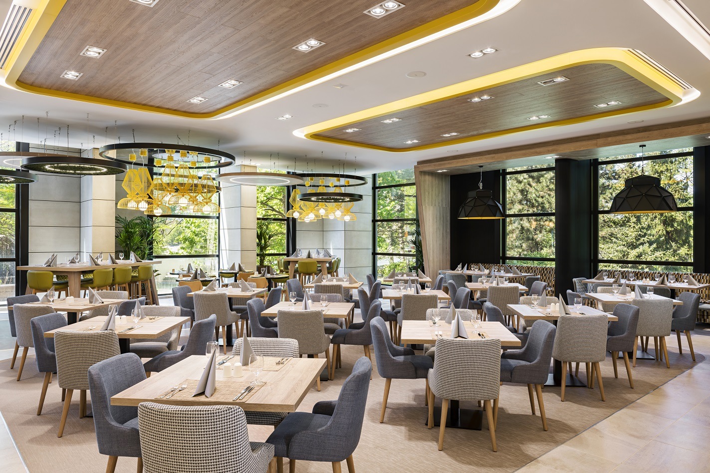 Első pillantásunk talán az asztalok és székek változatosságát veszi észre. Akár gyors reggeli, akár komótos, beszélgetős vacsora vagy modern munkaebéd a terv, minden alkalomhoz adott a megfelelő éttermi bútorzat. Magas, áramforrással ellátott, trendi asztalok hívogatják azokat, akik étkezés közben elektronikus eszközeiket szeretnénk feltölteni, vagy netán tabletjükön vagy laptopjukon kívánnak dolgozni. A falak mentén elhelyezett kényelmes kanapékat, ülőgarnitúrákat a beszélgetős együttlétek kedvelőinek hozták létre. A klasszikus 2 vagy 4 fős asztalokból van a legtöbb, a szállodai büféreggeli vagy a szállodában zajló rendezvények étkezései során erre van leginkább szükség az itt megforduló nagy vendéglétszámok miatt, az Episode étteremben ugyanis 308 vendég tud helyet foglalni egyidejűleg.